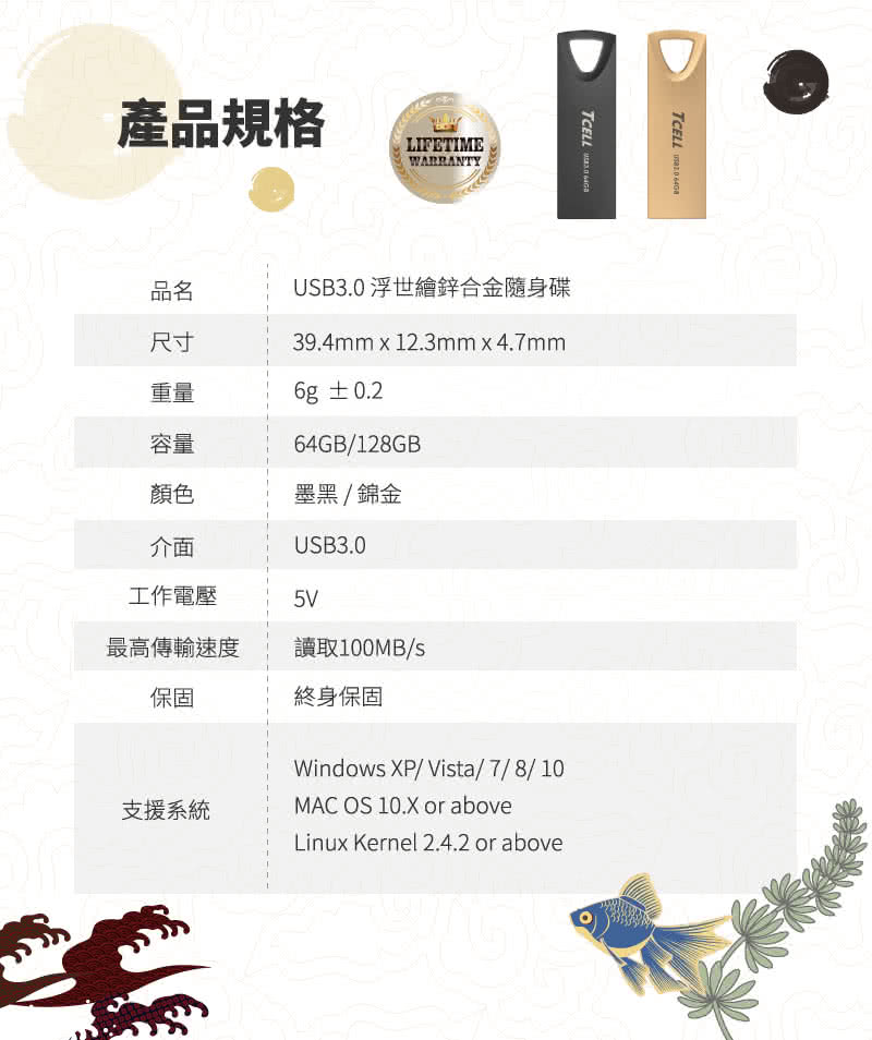 【TCELL 冠元】USB3.0 64GB 浮世繪鋅合金隨身碟耐用嗎不同作業系統都可以讀取嗎存檔容易失敗嗎